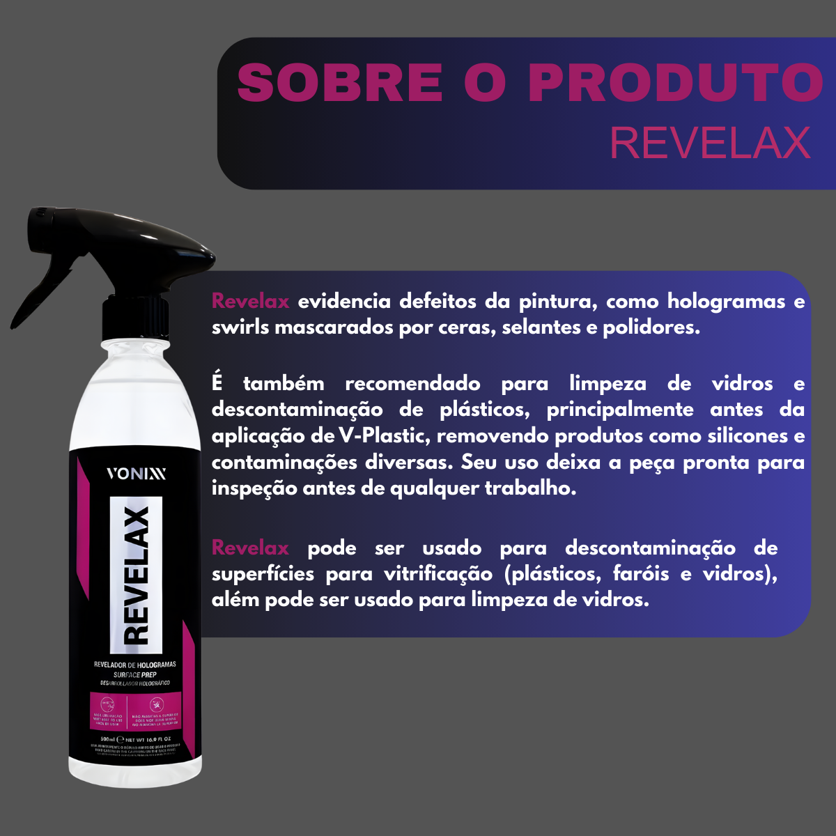 O Revelax é o produto ideal para quem busca perfeição na hora de inspecionar e preparar a pintura do carro. Ele evidencia de forma clara os defeitos escondidos, como hologramas e swirls mascarados por ceras, selantes e polidores, deixando a superfície pronta para qualquer trabalho.